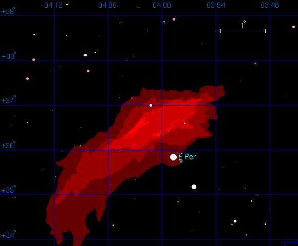 PoniŜej znajduje się mapa mgławicy Kalifornia, która rozpościera się na obszarze 4 stopni nieba. Obecnie wiadomo, Ŝe w tym regionie istnieje wiele ciemnych mgławic, więc mgławica Kalifornia jest prawdopodobnie tylko jaśniejszą częścią rozległego ciemnego obłoku