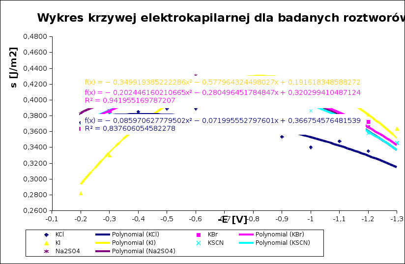 Równania krzywych elektrokapilarnych (wielomianów drugiego stopnia) dla poszczególnych roztworów |