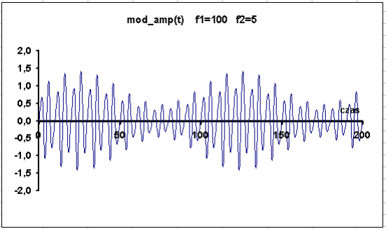 Sporządzić wykres modulacji amplitudy sygnału radiowego, sygnałem akustycznym dla czasu t = 0, 2, 4,…,200: | |||||||||||||||||||