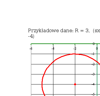 Wprowadź kontrolę poprawności danych: R - liczba dodatnia mniejsza od 100, współrzędne środka - liczby z <-100, 100> | ||||||||||||