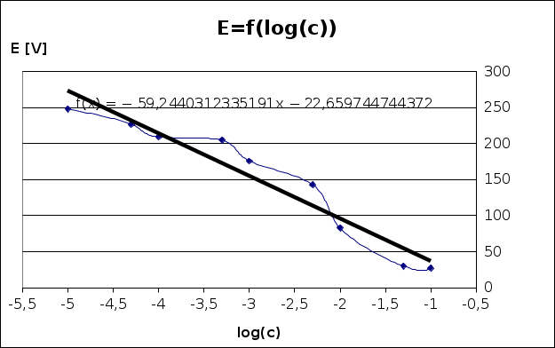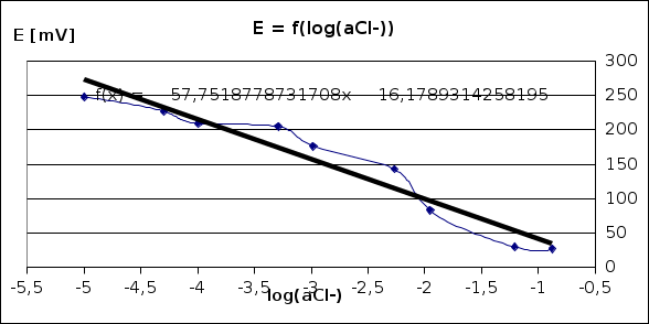 Stężenie jonów H+ | E [mV] | log(cCl-) | Siła jonowa | - log(γCl-) | log(aCl-) | E [mV] | ||||||||