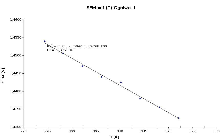 Ogniwo II | SEM=a+b*T | a= | 1,6769 | b= | -8,0000E-04 | Eo= | 1,4385 |