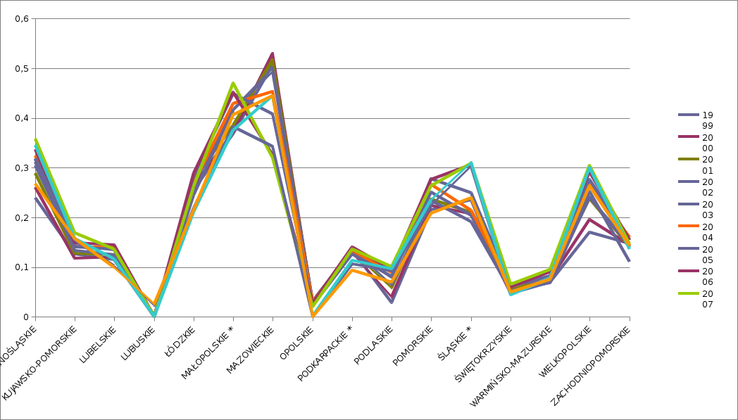DOLNOŚLĄSKIE | 0,268074435724285 | WARMIŃSKO-MAZURSKIE | 0,075561574143842 | ŚLĄSKIE * | 0,240123588268293 | |||||