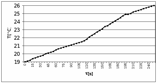 - Należało położyć badaną płytkę na mosiężnej płycie P2, następnie na badanej płytce izolatora umieścić puszkę z gliceryną -zbiornik ciepła. Ogrzać układ do chwili osiągnięcia stanu równowagi, tj. do ustalenia wartości T1-T2. Wyjąć płytkę izolatora i doprowadzić do ogrzania dolnej płyty o 3°C powyżej stanu równowagi. Następnie zdjąć puszkę z gliceryną i włączyć stoper. Co 5s odczytywać wartości, aż dolna płytka osiągnie temperaturę o 4° mniejszą od stanu równowagi.