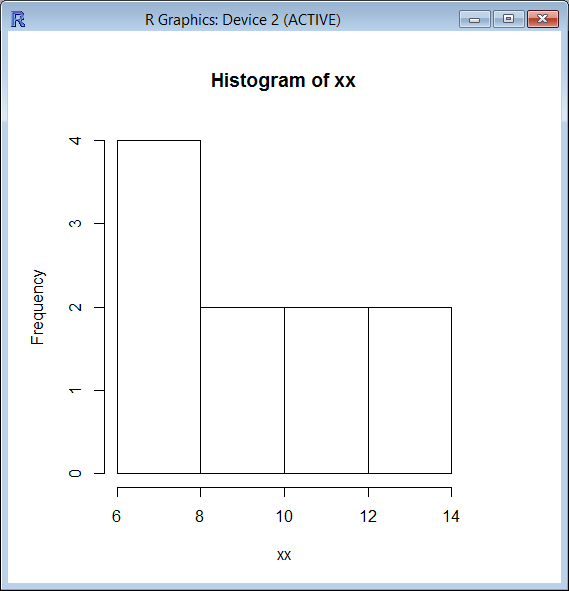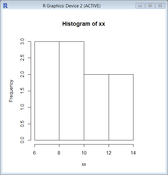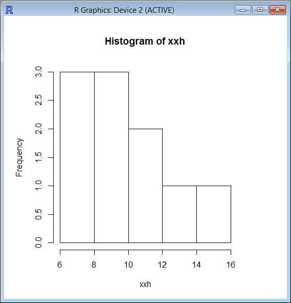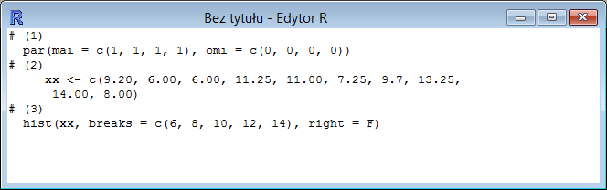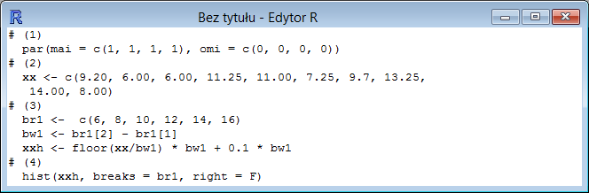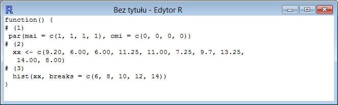 #3 Rysowanie historgramu za pomocą funkcji hist. Funkcja hist jest wywołana z argumentem right równym TRUE. Oznacza to, że przedziały na histogramie będą otwarte z prawej strony (domknięte z lewej strony). Dlatego tym razem Frequency w przedziale 8 – 10 wynosi 3 - w porównaniu z programem 1 wartość 8.0 należy do przedziału 8 – 10.
