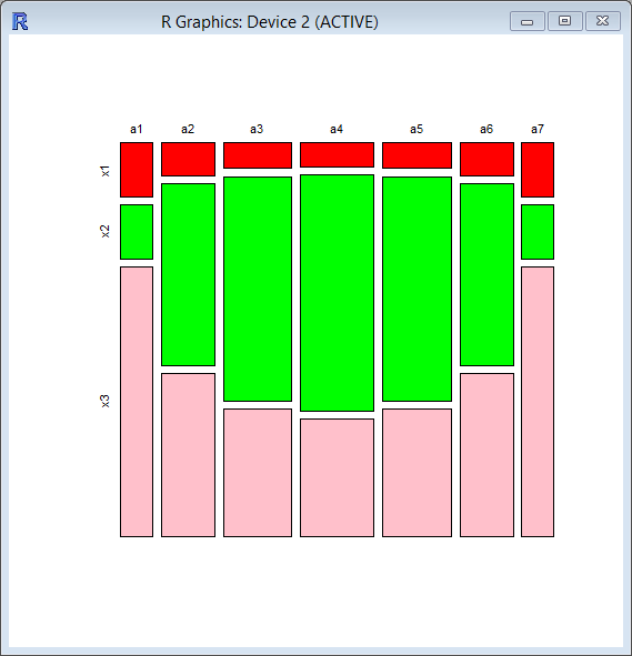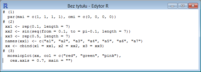 #3 za pomocą funkcji mosaicplot rysowany jest wykres mozaikowy pokazujący nam stosunek wartości poszczególnych elementów wektora.