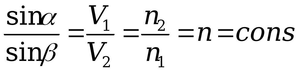gdzie jest kątem padania światła na płaszczyznę, a jest kątem załamanej wiązki światła. Obydwa kąty leżą na jednej płaszczyźnie i są mierzone względem prostej normalnej (N) do tej płaszczyzny. V1 i V2 są prędkościami światła odpowiednio w ośrodku I i II