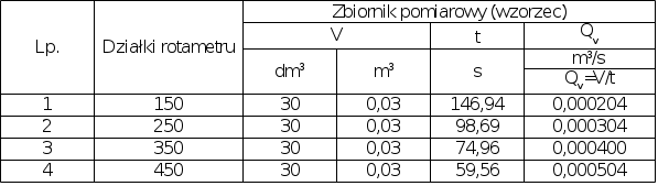 Wraz ze wzrostem ilości działek rotametru czas przepływu 30dm3 wody przez zbiornik pomiarowy maleje. Strumień objętości Qv rośnie ponieważ jest zależny od czasu i objętości. Objętość cieczy jest stała a czas maleje zatem Qv rośnie.