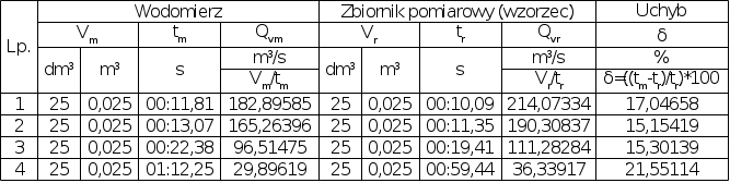 Po zmniejszeniu stopnia otwarcia zaworu regulacyjnego czas przepływu tej samej objętości cieczy(25dm3) rośnie. Uchyb błędu wodomierza wynosi od ~15 do ~21%. Oznacza to że wyniki pomiaru mogą być obarczone takim błędem