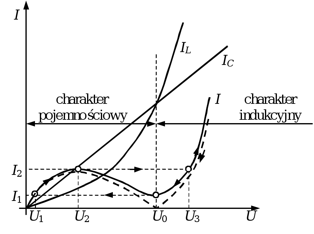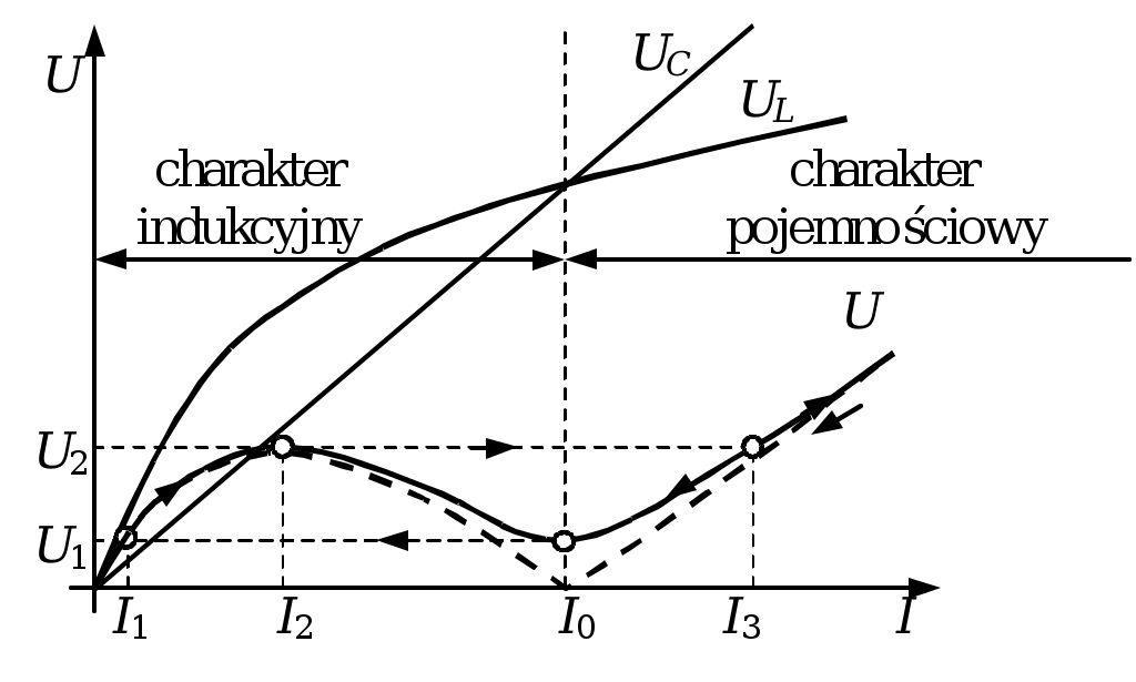 W dalszym ciągu pomija się występowanie zjawiska histerezy, przyjmując że charakterystyka magnesowania dławika (cewki z rdzeniem ferromagnetycznym) jest krzywą magnesowania pierwotnego. Dławik jest elementem nieliniowym - jego charakterystyka strumień skojarzony-prąd nie jest linią prostą, co oznacza, że przy sinusoidalnie zmiennym napięciu przebieg prądu jest odkształcony i zawiera wyższe harmoniczne (rys. 1). Zasilając dławik napięciem sinusoidalnie zmiennym o różnych wartościach skutecznych, można wyznaczyć wartość skuteczną pierwszej harmonicznej prądu w dławiku i na tej podstawie wykreślić charakterystykę prądowo-napięciową dławika UL(IL), przy czym jeszcze raz należy podkreślić, że UL oraz IL są wartościami skutecznymi pierwszych harmonicznych. Rozważmy szeregowy układ dławik-kondensator zasilany napięciem sinusoidalnym (rys. 3a). Narysujmy charakterystyki prądowo-napięciowe dławika UL(I) i kondensatora UC(I) (rys. 3b) oraz charakterystykę wypadkową U(I) (linia przerywana pogrubiona), przy czym U = |UL – UC|, jako że poszczególne harmoniczne uL i uC są w przeciwfazie. Widać, że istnieje taka wartość skuteczna prądu I = I0, dla którego wartość skuteczna napięcia zasilania U jest równa zeru (U(I0) = 0). Jest to efekt zrównoważenia napięć UL i UC. Zjawisko zrównoważenia napięć na dławiku i kondensatorze poprzez dobór wartości skutecznej prądu nosi nazwę ferrorezonansu napięć. Podczas ferrorezonansu napięć równoważą się jedynie pierwsze harmoniczne napięć uC i uL. Ponieważ napięcia uC i uL zawierają wyższe harmoniczne, które nie kompensują się wzajemnie, to wartość skuteczna napięcia uC + uL nie spada do zera, lecz do pewnej wartości minimalnej - na rysunku 3b ferrorezonansowi napięć odpowiada punkt (I0, U1). Wobec tego rzeczywista charakterystyka U(I) przebiega nieco wyżej od idealnej.