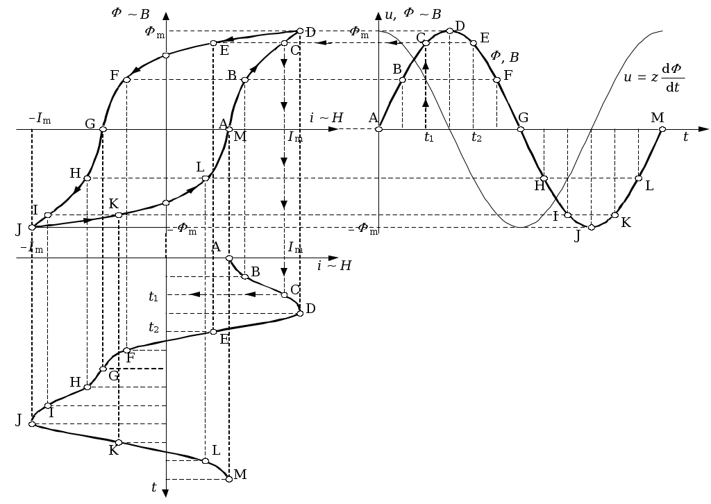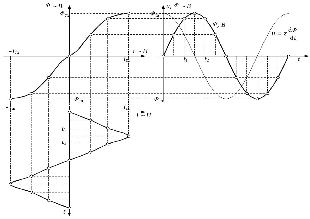 Rys. 1. Konstrukcja krzywej przebiegu prądu w cewce z rdzeniem ferromagnetycznym bez uwzględnienia zjawiska histerezy magnetycznej