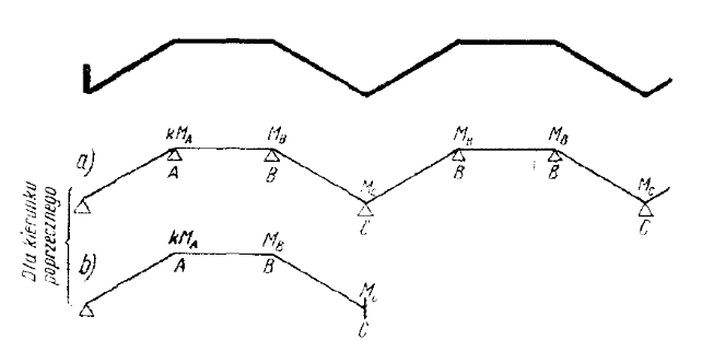 Krawędzie załamań płytowych tarcz traktuje się jako przegubowe podpory tej płyty. Oblicza się momenty podporowe, reakcje podporowe oraz momenty przęsłowe jak dla płyty ciągłej.