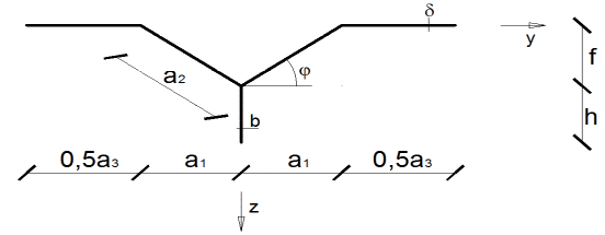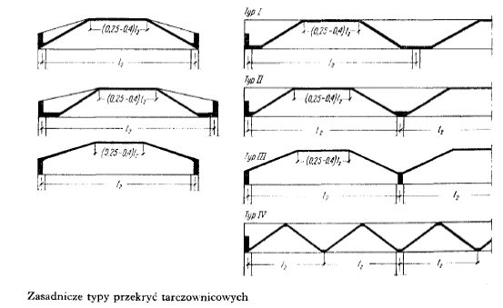 l2 jest długością fali; odległość między elementami wezgłowiowymi (pachwinowymi); nazywamy to rozpiętością tarczownicy; gdy przekrycie składa się z kilku równoległych fal połączonych ze sobą monolitycznie, nazywamy je wielofalowymi
