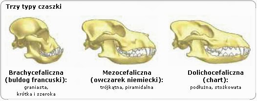 Wyróżniamy trzy rodzaje czaszek u psów: Brachycefaliczna ( graniasta, krótka i szeroka), Mezocefaliczna ( zwykła, trójkątna i piramidalna), Dolichocefaliczna (wybitnie długa, podłużna i stożkowata). Czaszki można także podzielić na mózgoczaszkę i trzewioczaszkę. W skład mózgoczaszki wchodzi kości: czołowa, sitowa, klinowa, potyliczna, skroniowa i ciemieniowe. Zatem w skład trzewioczaszki wyróżniamy: kości nosowe, jarzmowe, podniebienne oraz żuchwa.