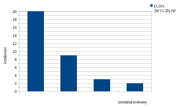 Na obszarze o powierzchni 5376m2 jest 30 klonów zwyczajnych. Z obliczeń można wnioskować, że 20 z nich jest w wieku poniżej lub równych 12 lat, kolejne 9 jest w przedziale wiekowym powyżej 12 do 25 lat, 3 klony są w wieku równym 25 do 40 lat, 2 ostatnie drzewa mają od 40- 55 lat. Metoda obliczania średnicy drzew za pomocą centymetra i podstawienie wyniku do wzoru na obwód koła pokazuje nam jedynie przybliżone wartości.