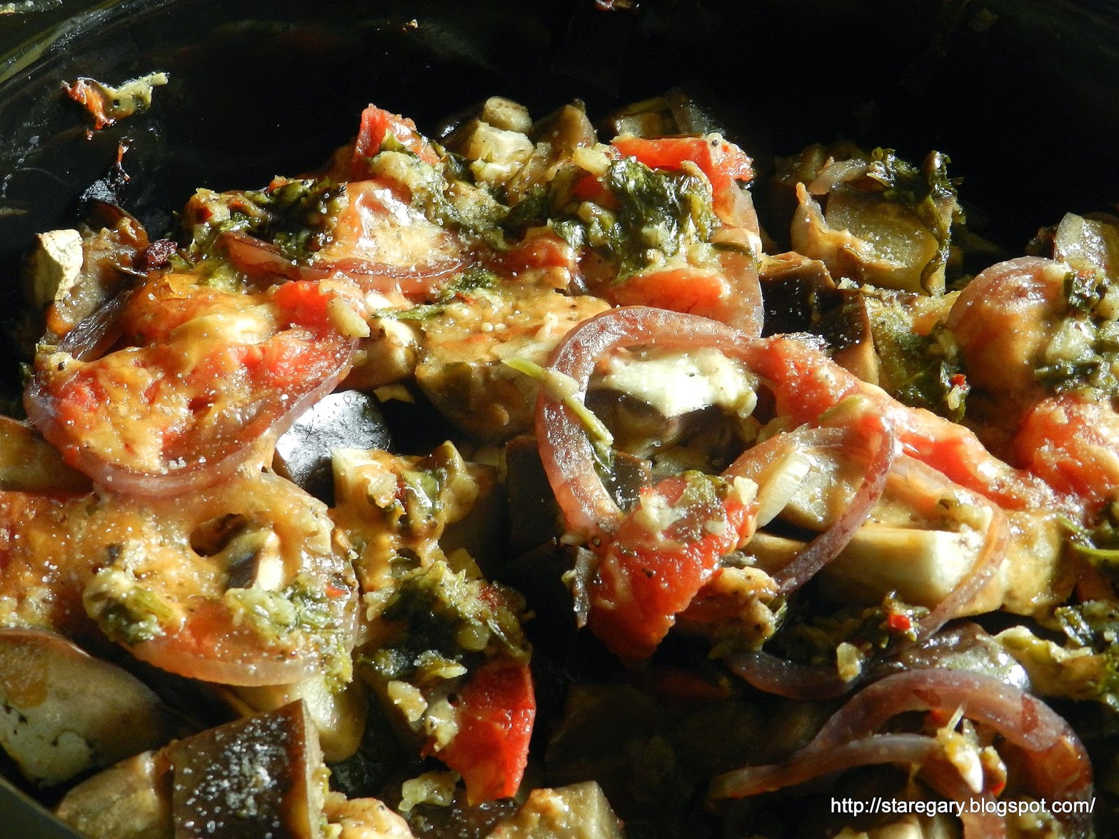 Uwagi: Przede wszystkim następnym razem nieco zmieniłabym kolejność warstw. Bakłażany powinny znaleźć się na spodzie (zamiast cukinii) a cukinię dałabym w miejscu bakłażanów. Dzięki temu bakłażany od początku byłyby przykryte, a to wydaje mi się dla nich lepsze. Dałabym więcej sera. Moim zdaniem sama oliwa z przyprawami to trochę mało, tak więc warto poszczególne warstwy doprawiać ,albo warzywa przed włożeniem do wolnowaru wymieszać w oliwie i przyprawach - i to wydaje mi się najlepszym rozwiązaniem.