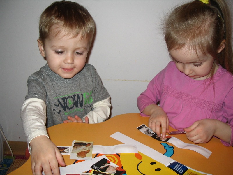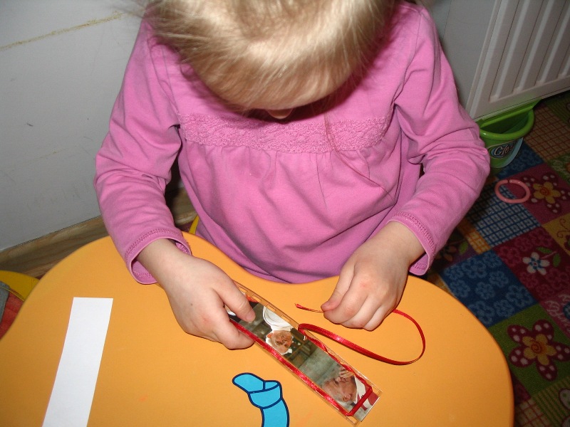 3. Na pasek papieru, który powinien być troszkę węższy niż folia naklej wycięte obrazki tak jak zrobiły to dzieci.