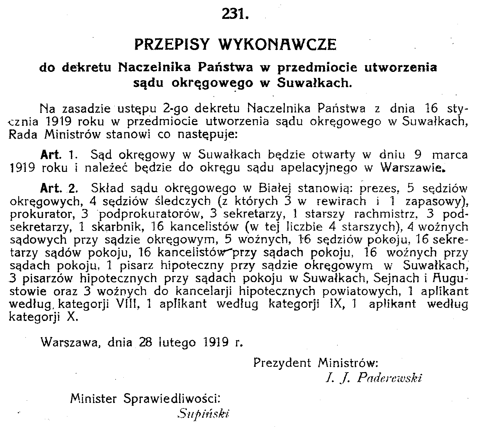 D19190231 Przepisy wykonawcze do dekretu Naczelnika Państwa w przedmiocie utworzenia sądu okręgowego w Suwałkach