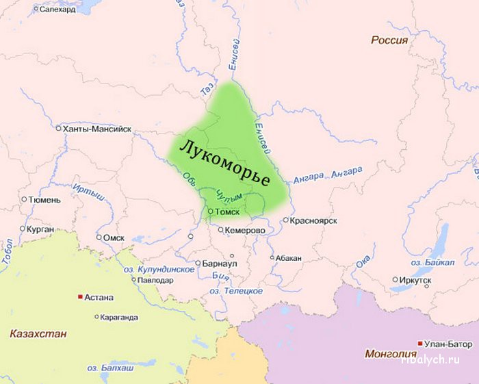 Pierwszymi żyjącymi w zach. Syberii przodkami byli ci, którzy żyli blisko Lukomoria (na „morskim” wybrzeżu). Lukomoriem później nazywano również jedno z Wielkich Syberyjskich carstw. Jest to dość konkretne miejsce geograficzne, basen rzeki Ob i Tom. Chociaż morza teraz tutaj niema, ale według całkiem wiarygodnych geologicznych danych 14000 lat temu na terytorium współczesnej zach. Syberii istniał ogromny, pozostały po stopnieniu lodu akwen, od północy spiętrzony przez lodowiec. Nie było to oczywiście morze w dosłownym słowa tego znaczeniu ale ogromny wodny basen, o którym w Rodowych przekazach z ust do ust nazywano morzem. Obdora … była wielkim carstwem wchodzącym w skład Jugorji, które długo należało do Lukomorii.
