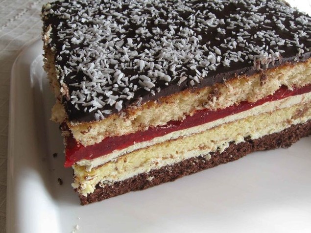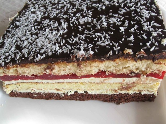 Biszkopt ciemny - połowa masy budyniowej - ciasto serowe - druga połowa masy budyniowej - prawie tężejąca galaretka z truskawkami - biszkopt jasny - polewa czekoladowa.