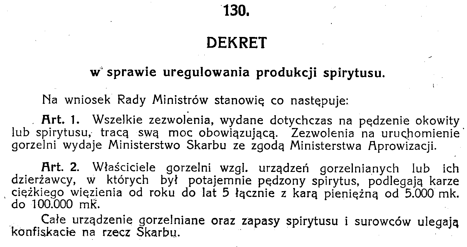 D19190130 Dekret w sprawie uregulowania produkcji spirytusu