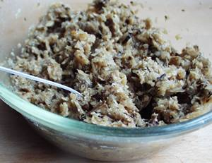 3) Ostudzoną kapustę wraz z grzybami mielimy. Jak zwykle próbujemy, czy nic jej nie brakuje. Dodajemy tartą bułkę i w ten sposób mamy gotowy farsz