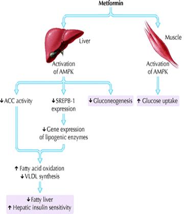 The mechanisms by which metformin exerts its antihyperglycemic effects are still not entirely clear. Its major action in patients with diabetes is to decrease hepatic glucose output, primarily by decreasing gluconeogenesis, but it may also, as a lesser effect, increase glucose uptake by skeletal muscles.47 In 2001, Zhou and colleagues discovered that metformin activates hepatic and muscle adenosine monophosphate-activated protein kinase (AMPK), an enzyme normally activated by adenosine monophosphate, the breakdown product of adenosine triphosphate and a cellular signal for increased energy requirements48 (Fig. 5). Activation of hepatic AMPK results in the phosphorylation and inhibition of acetyl-coenzyme A carboxylase, which catalyzes the rate-limiting step of lipogenesis. This block in fatty acid synthesis promotes fatty acid oxidation. In addition, activation of hepatic AMPK decreases expression of sterol-regulatory-element-binding-protein-1 (SREBP-1), a transcription factor implicated in the pathogenesis of insulin resistance, dyslipidemia and diabetes. Decreased SREBP-1 expression results in decreased gene expression of lipogenic enzymes, which further contributes to decreased triglyceride synthesis and hepatic steatosis. AMPK activation appears to be a critical step in the metformin-mediated reduction of hepatic glucose production and increase in skeletal muscle glucose uptake. Thus, AMPK is a major regulator of lipid and glucose metabolism and may be the key mediator of all the beneficial effects of metformin. Results of earlier studies, particularly those using other biguanide compounds (e.g., phenformin, buformin), suggest that another mechanism of action may be disruption of coupled oxidative phosphorylation in mitochondria.47 Whether this underlies the increase in AMPK activity because of a subtle increase in the ratio between adenosine monophosphate and adenosine triphosphate remains unclear. Other effects, such as increased expression of muscle hexokinase and the insulin-sensitive glucose transporter, may be secondary phenomena.49Metformin is not protein bound and is widely distributed, with maximum accumulation in the small intestinal wall. It is excreted, unmodified, by the kidneys.47