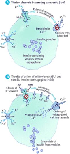 They cause hypoglycemia by stimulating insulin release from pancreatic B – cells. Their effects in the treatment of diabetes however are more complex. The acute administration of sulfonyl ureas to type 2 DM patient’s increases insulin release from the pancreas. Sulfonylurea also may further increase insulin levels by reducing hepatic clearance of the hormone .In the initial months of sulphonyl urea treatment, fasting plasma insulin levels and insulin responses to oral glucose challenges are increased. With chronic administration circulating insulin levels decline to those that existed before but despite this reduction insulin levels reduced plasma glucose levels are maintained .the explanation for this is not clear, but it may relate to reduced plasma glucose allowing circulating insulin to have more pronounced effects on its target tissues and to the fact that chronic hyperglycemia impairs insulin secretion (glucose toxicity). 11