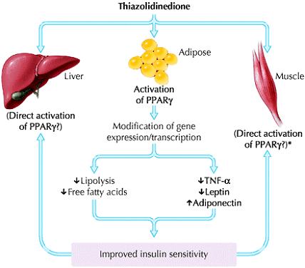 Thiazolidinediones are selective agonists for the peroxisome proliferator-activated receptor gamma (PPAR γ), which is most highly expressed in adipocytes (Fig. 4). These nuclear receptors, which are ligand-activated transcription factors, play an integral part in the regulation of the expression of a variety of genes involved in carbohydrate and lipid metabolism. Thiazolidinediones require insulin to be present for their activity; it increases insulin sensitivity, particularly in the peripheral tissues. Although unproven, this appears to be mainly mediated through an effect on adipocytes, since there are fewer PPAR γ receptors in muscle tissue. In the adipocyte, differentiation is enhanced, lipolysis is reduced, and levels of circulating adipo-cytokines or adipokines are altered, namely a decrease in tumour necrosis factor-a and leptin and an increase in $adiponectin.29$