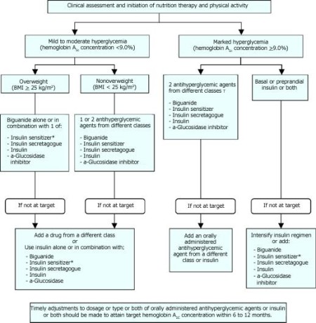 Fig. 6: Management of hyperglycemia in type 2 diabetes. BMI = body mass index.(When used in combination with insulin, insulin sensitizers may increase the risk of edema of congestive heart)