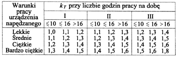 kT=1,1 – współczynnik uwzględniający charakter pracy (silnik sterowany falownikiem o płynnym rozruchu)( Tab. 8.)
