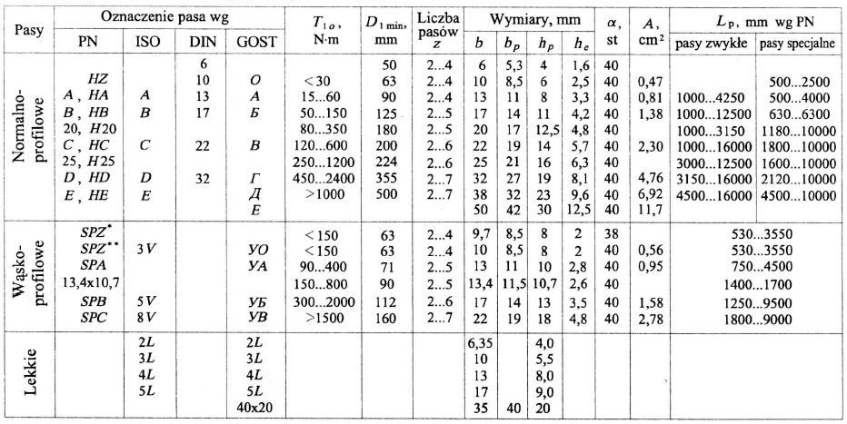 Tabela 1. Parametry i wymiary przekroju poprzecznego klinowych pasów normalnoprofilowych.