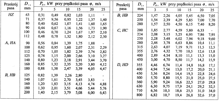 Tabela 6. Moc Po przenoszona przez jeden pas klinowy normalno profilowy, kW