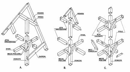 4. Więźby otwarte: A, B. otwarta więźba jętkowa – wolna ze