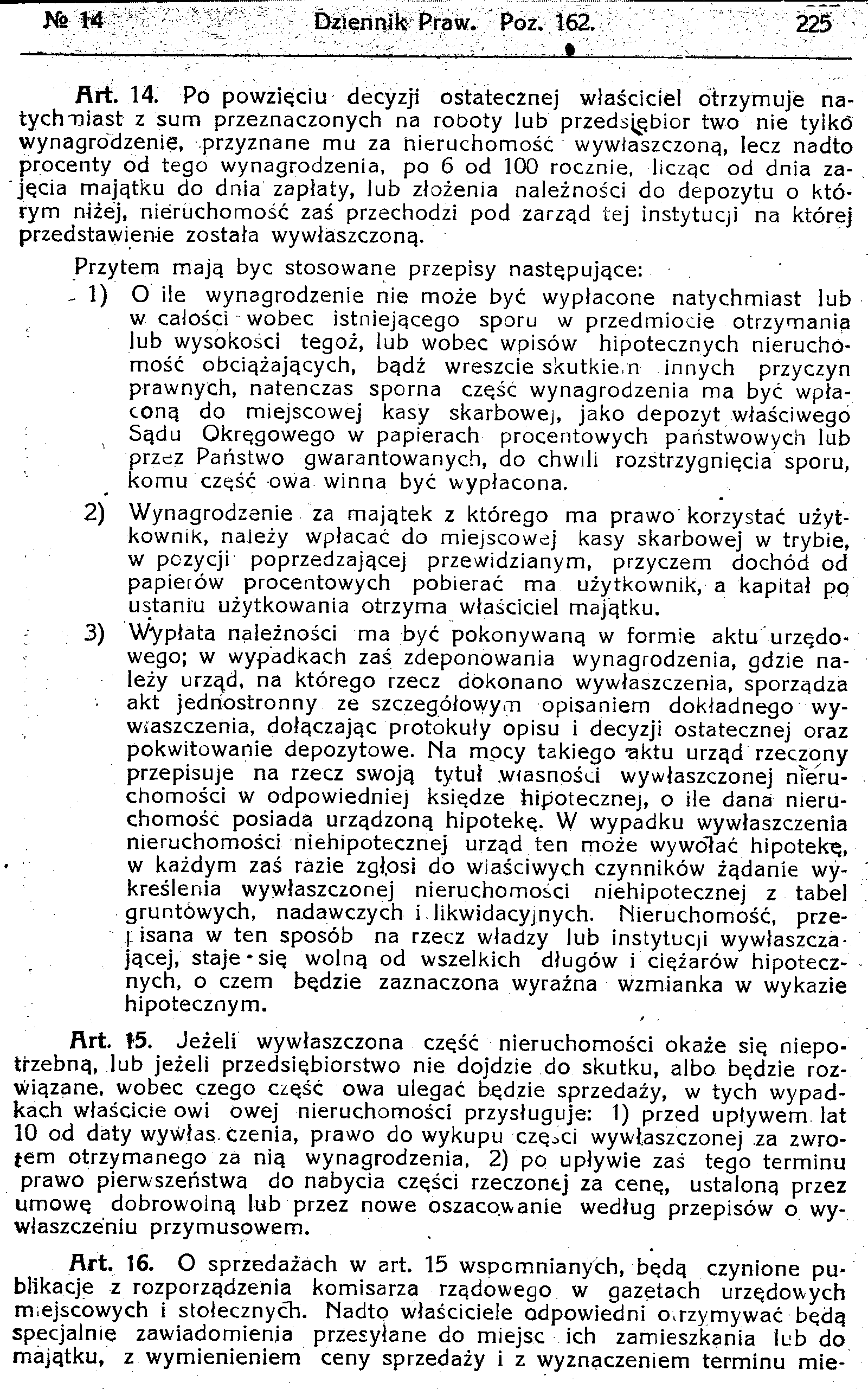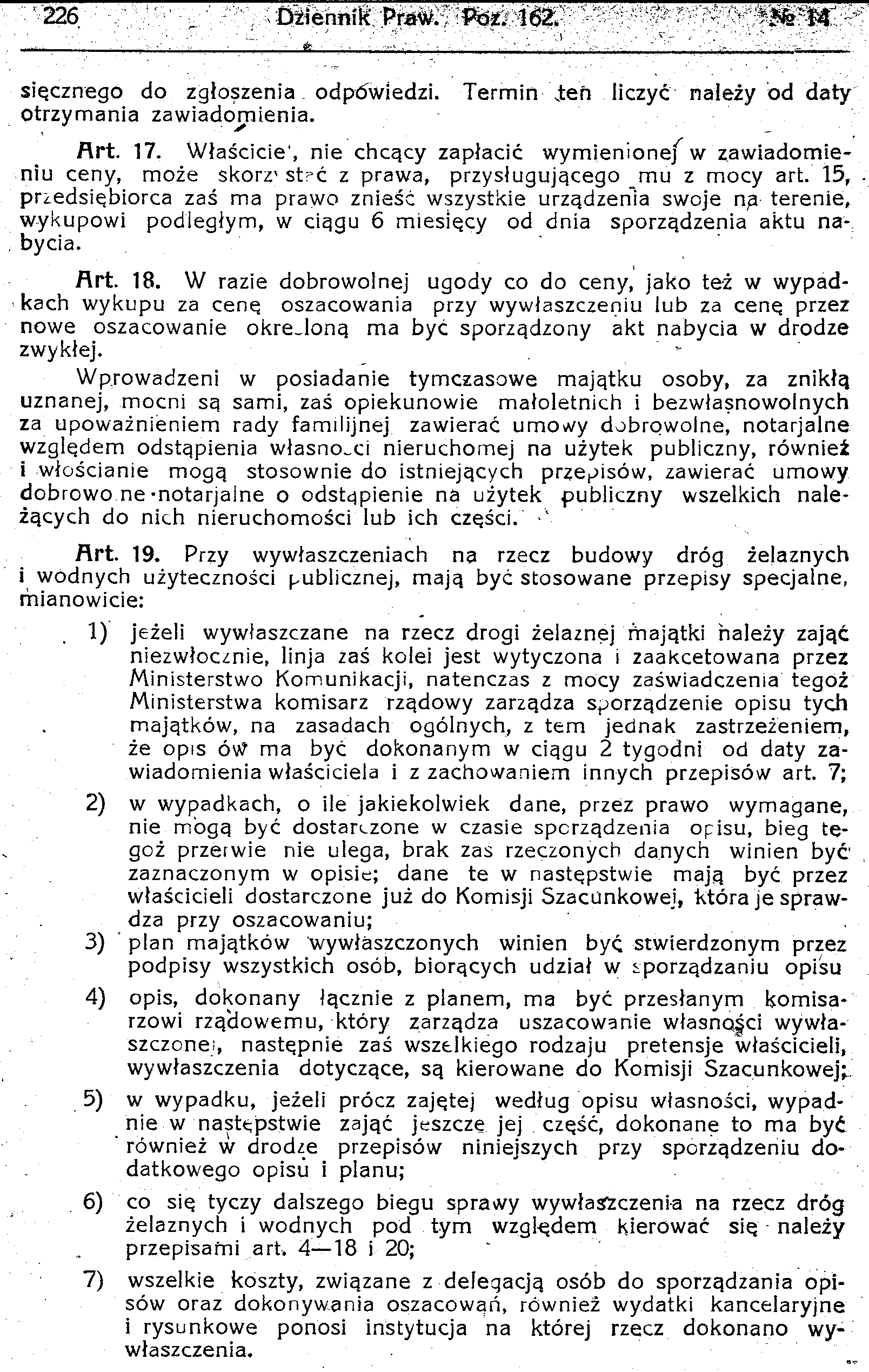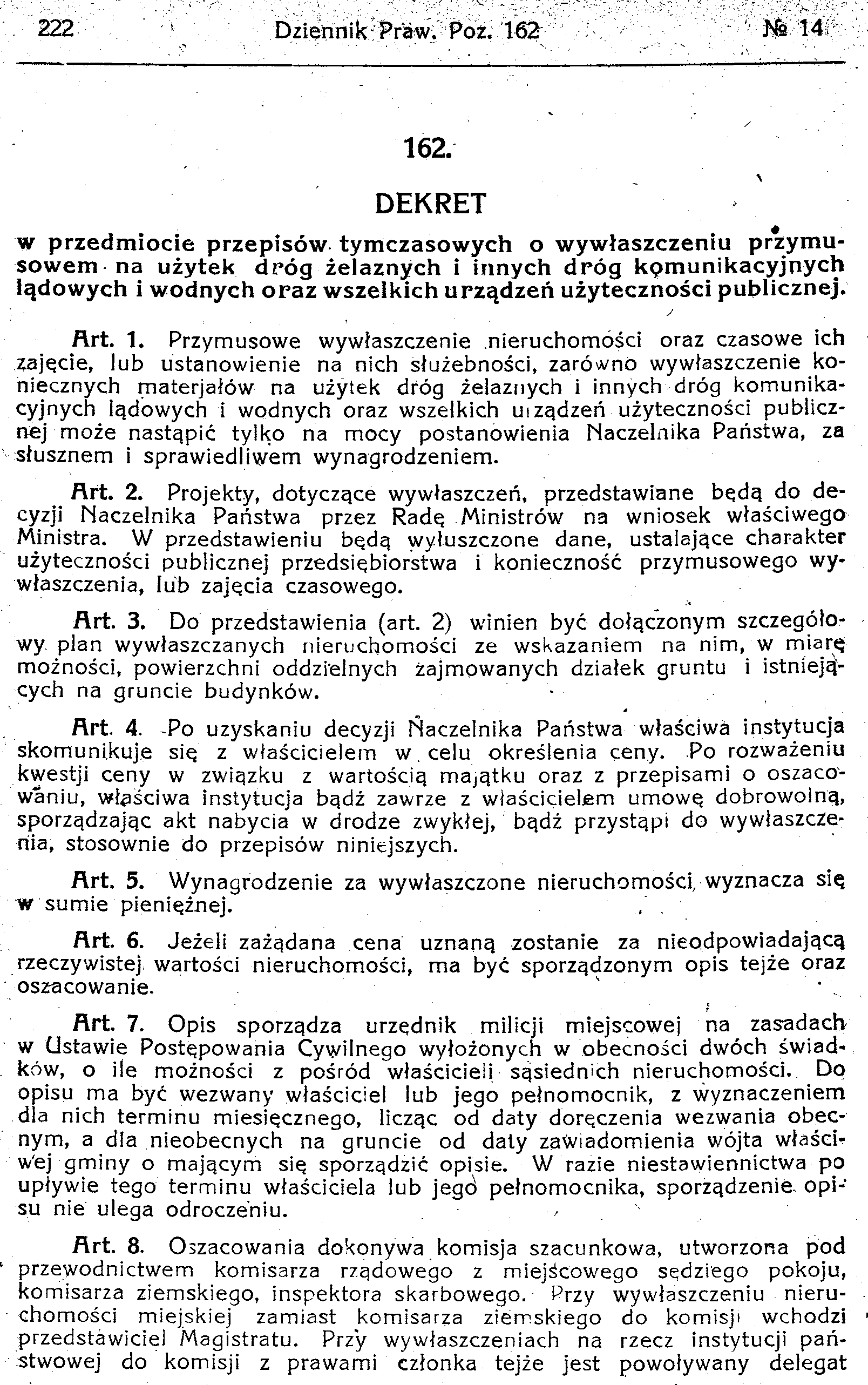 D19190162s Dekret w przedmiocie przepisów tymczasowych o wywłaszczeniu przymusowem na użytek dróg żelaznych i innych dróg komunikacyjnych lądowych i wodnych oraz wszelkich