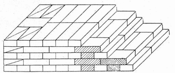 Pionowe spoiny podłużne pięciu kolejnych warstw wozówkowych przykrywane są dopiero szóstą warstwą ułożoną główkowo;