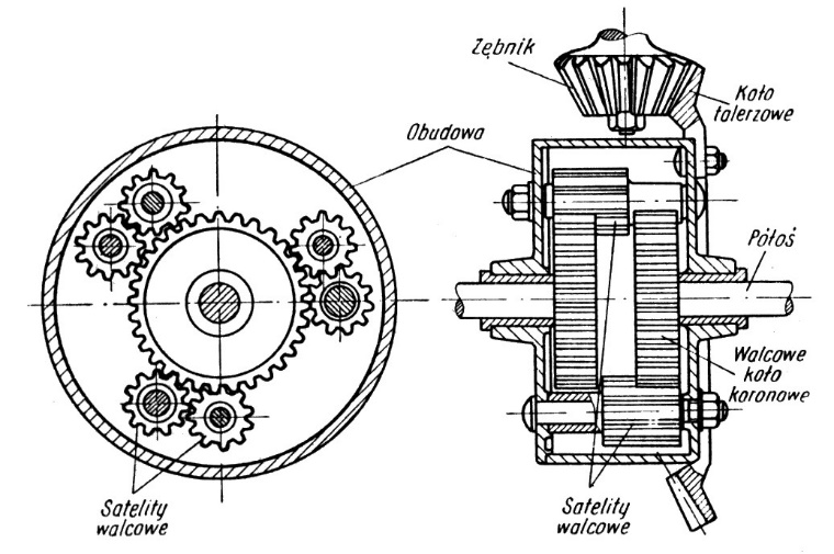 Chcą przedstawić budowę oraz zasadę działania hybrydowego mechanizmu różnicowego niezbędne jest przedstawienie dwóch odmian mechanizmu różnicowego, które są elementami składowymi hybrydowego mechanizmu rozdziału mocy.