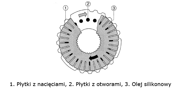 Obudowa wypełniona jest olejem, który w zależności od klasy może być olejem silikonowym lub olejem magnetoreologicznym reagującym na zmianę pola magnetycznego. Olej silikonowy zmienia swoją lepkość pod wpływem temperatury. W niskiej temperaturze lepkość oleju jest niewielka i pakiety płytek poruszają się bez oporów. Wraz ze wzrostem temperatury lepkość znacząco wzrasta, co powoduje powstanie dużych oporów pomiędzy płytkami i zesprzęglenie obu półosi. Przy małej różnicy prędkości obrotowej półosi temperatura oleju jest niska co powoduje, że sprzęgło lepkościowe działa jak otwarty mechanizm różnicowy. Jeżeli różnica prędkości obrotowych kół będzie znaczna, poślizg pomiędzy płytkami powoduje wzrost ciśnienia oraz temperatury oleju i natychmiastowe zesprzęglenie półosi. Poprzez zmianę ilości oleju w obudowie można zdecydować jak szybko i przy jakiej różnicy prędkości obrotowych sprzęgło zacznie działać. Mechanizm rozdziału mocy ze sprzęgłem wiskotycznym przekazuje więcej momentu obrotowego na koło o lepszej przyczepności.