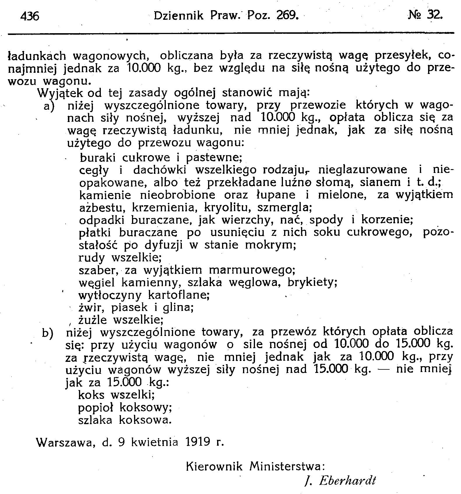D19190269 Rozporządzenie Ministra Kolei Żelaznych o sposobie obliczania opłat za przewóz ładunków w