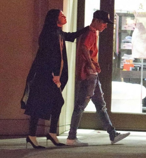 Gomez i Justin Bieber wychodzący z Montage Hotel