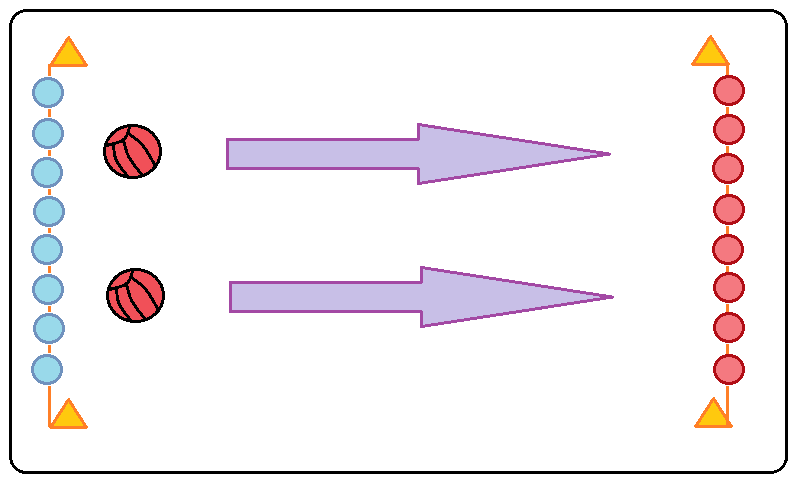 Ustawienie – dwa szeregi naprzeciw siebie w odległości 5-7 kroków; między uczestnikami odstęp 2-3 kroki; przed prawoskrzydłowymi leżą dwie piłki.