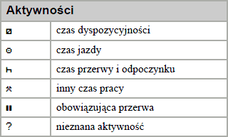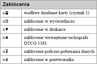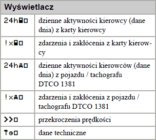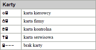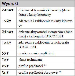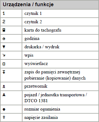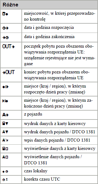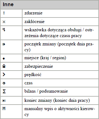 Zachęcamy do zapoznania się z piktogramami. W zależności od typu tachografu (producenta) po za podstawowymi piktogramami mogą występować dodatków specyficzne oznaczenia.