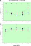 After 5 days of training, the main effect of training session was significant for SCR in the IBMT group in comparison with the relaxation group [F (1, 41) = 9.937; P < 0.01]. The group × session interaction was significant [F (1, 41) = 6.652; P < 0.01]. Further, in comparison with relaxation, SCR was significantly lower during practice periods 2 and 3 and after baseline (but not during period 1 and before baseline), indicating that the SCR was related to the amount of training (see Fig. 1A).