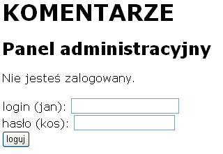 Rys. 4. Witryna „Komentarze”. Panel administracyjny z formularzem do logowania.