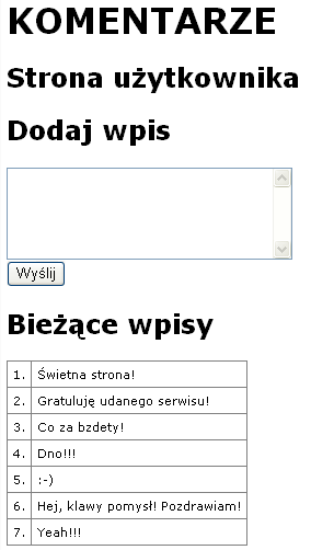 Rys. 6. Witryna „Komentarze”. Uzytkownik nie musi sie logowac. Formularz umozliwia dodawanie wpisów.