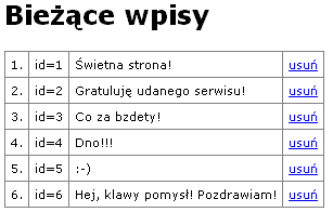 Rys. 5. Witryna „Komentarze”. Panel administracyjny po zalogowaniu: administrator moze usuwac wpisy.