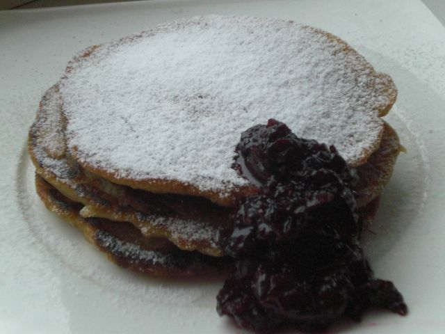 Wszystko wymieszać, by powstało dość gęste, ale lejące się ciasto. Placki wykładać łyżką na patelnię z rozgrzanym olejem i smażyć z obu stron na złotobrązowy kolor. Można podawać z syropem daktylowym lub z dżemem.