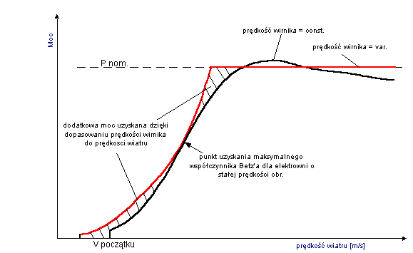 Wykres przedstawia jaką moc uzyskujemy z elektrowni przy określonej prędkości wiatru. Maszyna pracującą ze zmienną prędkością obrotową pracuje z tak dobranymi obrotami, żeby współczynnik wykorzystania wiatru był jak najwyższy. Wirnik pracujący ze stałą prędkością obrotową, ma jeden tylko taki punkt w którym współczynnik wykorzystania wiatru jest największy (tu oba wykresy są zbliżone). W pozostałych przypadkach, pracuje on z mniejszą sprawnością. Poza tym następują wahania mocy przy prędkościach wiatru przekraczających wartość nominalną. Biorąc pod uwagę roczną produkcje energii elektrownia pracująca ze zmienna prędkością obrotową, dostarczy więcej energii w ciągu roku.