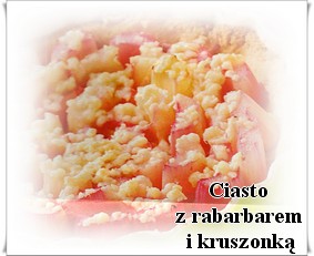 1 kg rabarbaru Z podanych składników zagnieść ciasto i wstawić je do lodówki na co najmniej 1 godzinę. Umyty i obrany rabarbar pokroić na małe kawałki (4 cm). Ciasto rozwałkować i wyłożyć nim wysmarowaną tłuszczem tortownicę (średnica 28 cm). Na cieście ułożyć rabarbar i posypać cukrem. Przygotować kruszonkę: rozcierając w palcach masło, cukier mąkę i cukier waniliowy. Rabarbar posypać kruszonką. Ciasto wstawić do nagrzanego piekarnika i piec około 40 minut w temperaturze 200 st.C. Przed podaniem ciasto posypać cukrem pudrem.