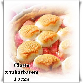 4-5 łodyg rabarbaru Mąkę wymieszać z cukrem pudrem i szczyptą soli. Dodać masło i posiekać. Palcami zagnieść ciasto, po czym ulepić z niego kulę, zawinąć w folię i włożyć do lodówki na pół godziny. Dużą formę do tarty wyłożyć ciastem i podpiec w piekarniku 10 minut w temperaturze 200 st.C. Rabarbar umyć, osuszyć i obrać. Pokroić go na 2-centymetrowe kawałki. Wymieszać rabarbar z cukrem i ułożyć na podpieczonym cieście. Białka ubić, stopniowo dodawać cukier i wyłożyć na ciasto. Piec w temperaturze 180 st.C. aż beza będzie złota.